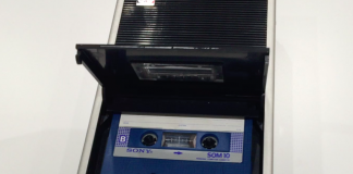◎撮影場所 ソニービル “ソニーのコンパクトカセットテープレコーダー第1号機で、重さはわずか1.75kg。ピアノ式と呼ばれる操作ボタンと、テープが飛び出すイジェクト方式は好評だった。”